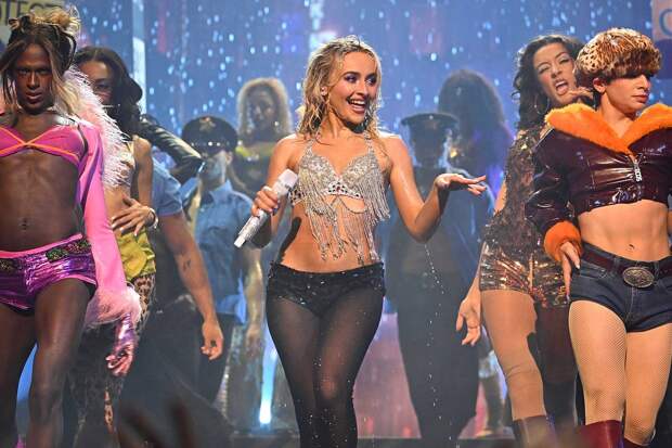 Американская актриса и певица Сабрина Карпентер в откровенном образе вышла на публику. Соответствующий кадры публикует Page Six. 26-летняя знаменитость выступила на церемонии вручения премии VMA 2025 в сияющем бюстгальтере, декорированном стразами и бахромой. Помимо этого, звезда надела черные капроновые колготки с люрексом и микрошорты поверх них.